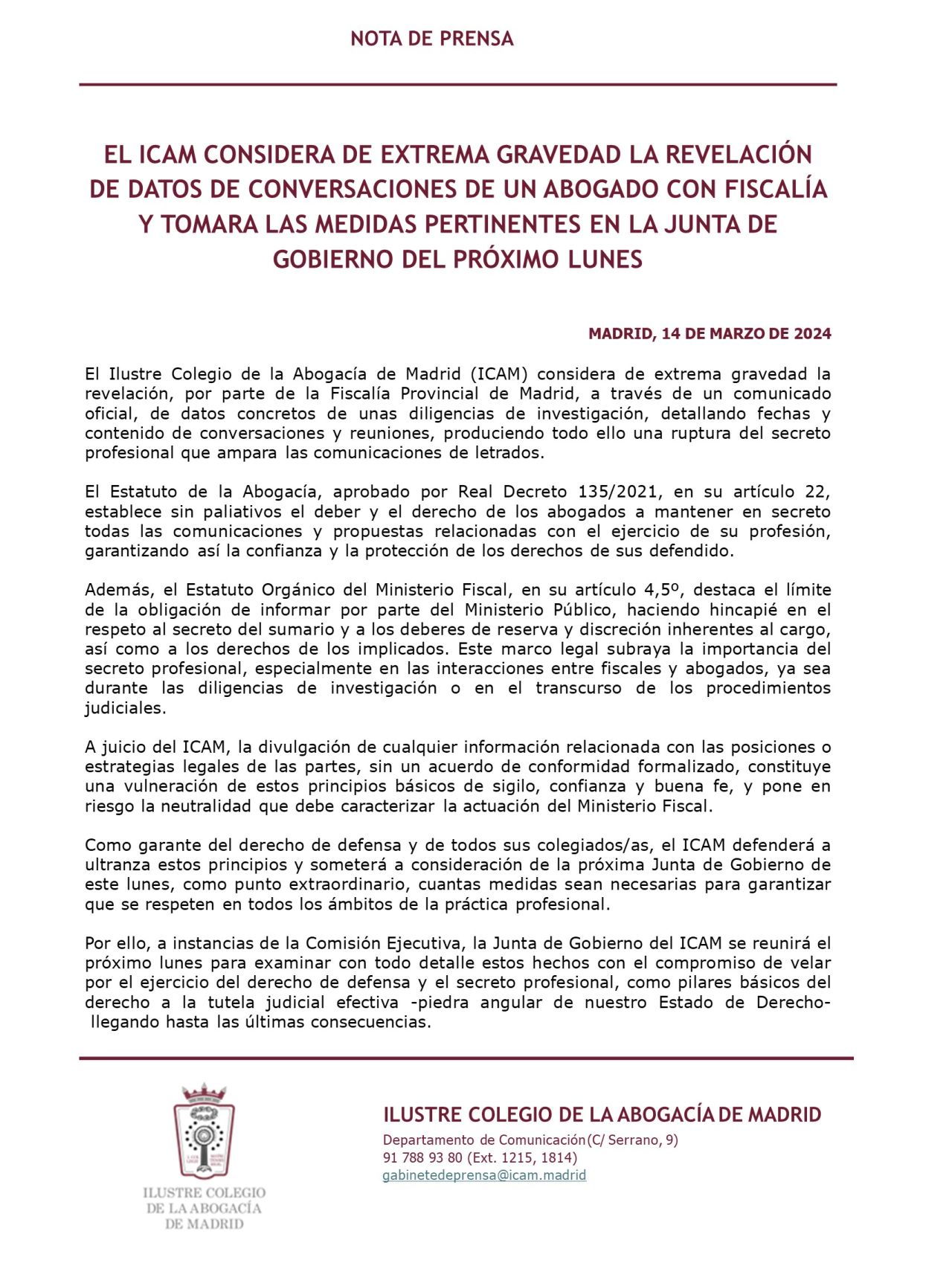 El 14 de marzo de 2024, el ICAM calificó de "extrema gravedad" la acción de la Fiscalía de exponer públicamente datos específicos de las diligencias de investigación, violando así el deber de confidencialidad que rige las comunicaciones entre abogados y sus clientes. Esta situación no solo pone en peligro la confianza esencial en la relación abogado-cliente, sino que también amenaza el pilar fundamental de nuestro Estado de Derecho: el derecho a una defensa justa y equitativa.
